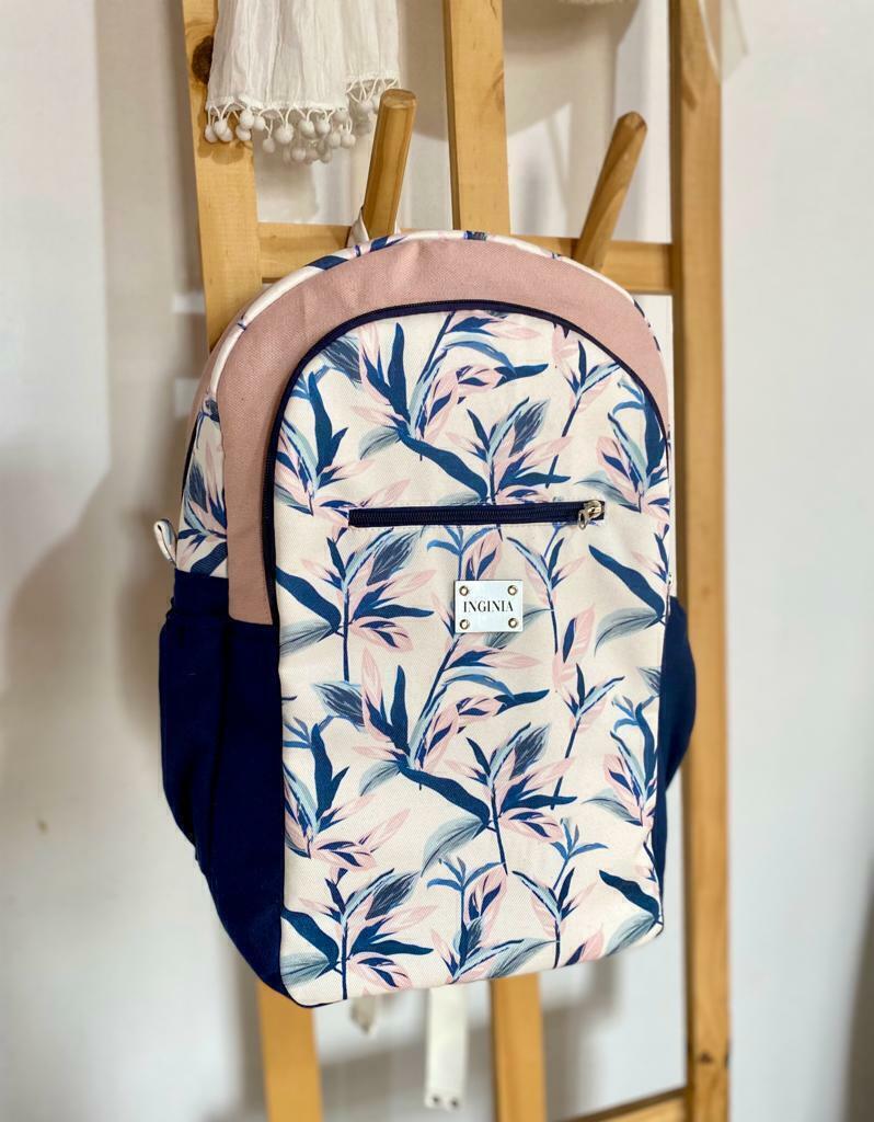Mochila confeccionada en tela de tapiceria y gabardina gruesa, entretelada y forrada. Espalda y base acolchadas. Correas regulables.